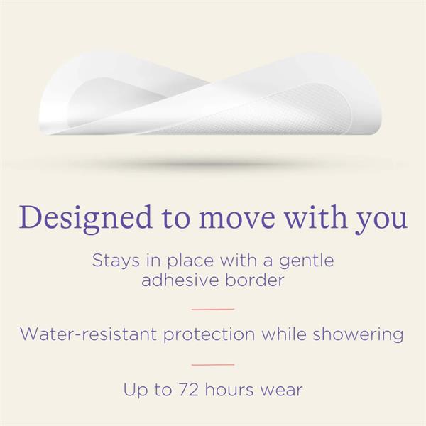 The gel padding minimizes friction and rubbing as you move, plus provides cooling, soothing relief for your tender, itchy, healing skin. Sterilized for hygiene and designed for all day wear – up to 72 hours (about 3 days) per pad.